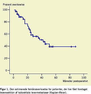 Resektion med en femårsoverlevelse på 25-41% [15-17] må indtil videre betragtes som guldstandarden i behandlingen af levermetastaser efter kolorektal cancer [18]. Prognosen for den enkelte patient vil afhænge af flere faktorer. Således har patienter med en Dukes' C-primærtumor, synkrone metastaser, multiple metastaser, præoperativ karcinoembryonalt antigen > 200 ng/ml eller største metastase > 5 cm i diameter en dårligere prognose end andre, og jo flere faktorer jo dårligere prognose. Eksempelvis er den estimerede femårsoverlevelse 60%, hvis man ikke har nogen af de nævnte variable, hvorimod femårsoverlevelsen kun er 14%, såfremt man har alle fem variable [16]. I dette materiale var den estimerede femårs overlevelse 39%, hvilket svarer til, hvad man har fundet i andre større serier [15-17]. I forhold til, hvad der er angivet i andre materialer [14, 15], havde en større del af vore patienter synkrone metastaser (75% vs. 20-52%), hvilket som nævnt er et dårligt prognostikum. Årsagen til den store andel af patienter med synkrone metastaser i vores materiale kendes ikke. Men den opfølgning, der i dag tilbydes patienter, der er opereret for kolorektal cancer, er tilsyneladende ikke sufficient nok til at finde de patienter, der får metakrone levermetastaser. Kun 14% af vores patienter havde metastaser i begge leverlapper. Dette er væsentligt mindre, end hvad der ses i andre materialer, for eksempel havde 40% af patienterne fra Sloan-Kettering Cancer Center i New York [16] bilaterale levermetastaser. En årsag til denne store forskel kunne være, at der herhjemme stadig hersker en vis nihilisme over for denne patientgruppe. Her må det understreges, at såfremt man opnår en resektion, hvor tumoren er makro- og mikroskopisk radikalt fjernet, er prognosen også for disse patienter rimelig god, med en estimeret femårsoverlevelse på 29-32% [16].