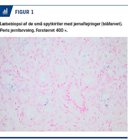 niveau af fibrinogen, kreatininniveau 180 mikromol/l (referenceværdi: 53-97 mikromol/l) samt normale værdier af aminotransferaser, laktatdehydrogenase, infektionstal og ammonium. En direkte antiglobulintest var negativ. Løbende trombelastografi viste dysfungerende trombocytter og global koagulopati, der var foreneligt med forbrug. I samråd med blødningsvagten blev der givet trombocyttransfusion, frisk frosset plasma og kryopræcipitat. I drengens andet levedøgn faldt INR-værdien til 2,2, men steg derefter til > 5, og han blev alment påvirket med sporadisk hypoglykæminiveau ned til 1,6 mmol/l. Der tilkom ascites, oliguri og hypoalbuminæmi på 12 g/l (referenceværdi: 26-34 g/l). En bloddyrkning var uden vækst. Da drengen var en uge gammel måltes ferritinniveau på 2.820 mikrog/l (referenceværdi: < 200 mikrog/l) og konjugeret bilirubinniveau på 90 mikromol/l (referenceværdi: < 20 mikromol/l). Han havde akut leversvigt og blev overflyttet til Rigshospitalet mhp. behandling og transplantationsvurdering. En læbebiopsi viste jernaflejring i de små spytkirtler, hvilket er foreneligt med GALD (Figur 1). Urinmetabolisk screening og øvrig hepatologisk udredning var negativ. Trods behandling med bl.a. IVIG og plasmaferese forblev tilstanden dårlig, og en levertransplantation vurderedes at være udsigtsløs. Han døde fire uger gammel med multiorgansvigt.