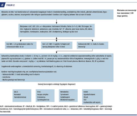 NALF kan vise sig kort efter fødslen med uspecifikke symptomer som sløvhed, spiseproblemer og ikterus, der kan forveksles med sepsis, hvorved diagnosen forsinkes. Hos patienten i sygehistorien fandt man i første levedøgn ikterus og koagulopati, som kortvarigt blev korrigeres med K-vitamin og antibiotika. Efter udelukkelse af erytrocyt- og trombocytimmunisering samt sepsis fik man mistanke om leversvigt (Figur 2). Ved NALF ses hypoglykæmi, konjugeret hyperbilirubinæmi, koagulopati, hypoalbuminæmi, forhøjet ferritinniveau og evt. forhøjede aminotransferaseværdier. Normale aminotransferaseværdier udelukker ikke leversygdom. Til forskel fra leversvigt hos ældre børn kan NALF defineres som vedvarende koagulopati med INR-værdier