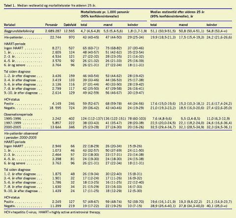 Mortalitetsraten var 43 pr. 1.000 personår (95% konfidensinterval (KI): 40-45) for hiv-inficerede personer, og 4,7 (KI: 4,6-4,8) for baggrundsbefolkningen (Tabel 1). Den højeste mortalitetsrate, 124 (KI: 112-137), sås i præ-HAART-perioden (1995-1996), faldende til 38 (KI: 33-43) i tidlig HAART-perioden (1997-1999), og til 25 (KI: 23-28) i sen HAART-perioden (2000-2005).