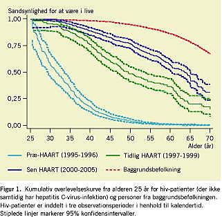 Den mediane overlevelse for hiv-patienter sammenlignet med baggrundsbefolkningen har tidligere været vanskelig at estimere. Ved at kombinere data fra Den Danske HIV Kohorte med Det Centrale Personregister var det muligt at foretage en sammenligning af overlevelsen blandt hiv-inficerede og ikke-hiv-inficerede personer. I årene 2000-2005 var den mediane restlevetid for en 25-årig 51 år for baggrundsbefolkningen og 39 år for en hiv-patient, der ikke samtidig havde hepatitis C-virus-infektion. Hiv-patienters forventede levetid er god, men langtfra normal.
