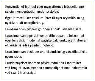 Således forårsager traditionel inotropi eksacerbation af Ca2+ -overload ved hjertesvigt med øget arytmirisiko og energi-forbrug [5]. Levosimendans inotrope mekanisme udøves udelukkende på sarkomerniveau og påvirker ikke transmembrane potentialer eller Ca2+ -koncentrationer, hvorfor arytmirisikoen er nedsat sammenlignet med traditionel inotropi. Endvidere er den inotrope stimulation via Ca2+ -sensitisere som nævnt energetisk favorabel sammenlignet med traditionel inotropi [2, 6-8].