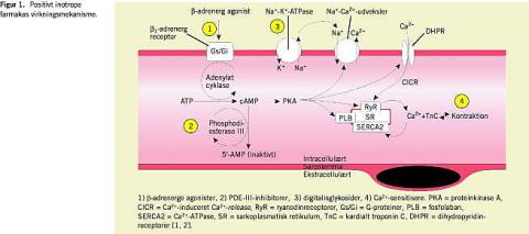Traditionelle positivt inotrope farmaka øger ved deres receptorbinding den intracellulære Ca2+ -koncentration i myocytterne under systolen, hvorved myokardiets kontraktilitet øges. Medikamenterne inddeles groft i tre grupper efter virkningsmekanisme: β -adrenerge agonister, fosfodiesterase III-hæmmere (PDE-III-inhibitorer) og digitalisglykosider (Figur 1 ).