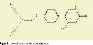 Levosimendan (Figur 2 ), den aktive (-)-enantiomer af simendan, tilhører gruppen af Ca2+ -sensitisere, hvis inotrope effekt udøves på selve kontraktionscyklus ved populært sagt at optimere udnyttelsen af tilstedeværende intracellulært Ca2+ under systolen. Herved øges myokardiets kontraktilitet cAMP-uafhængigt, således at Ca2+ -koncentrationen holdes upåvirket [4].
