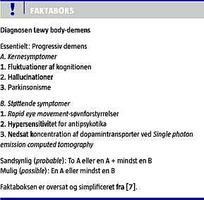 Selv om neuropsykiatriske symptomer hos ældre kan skyldes mange tilstande, er det vigtigt af have DLB-diagnosen i tankerne, når man møder ældre demente patienter med visuelle hallucinationer, der evt. kan være ledsaget af fluktuationer af kognitionen og parkinsonisme, idet 50% vil have svær til livstruende overfølsomhed for antipsykotika. Med nye diagnostiske kriterier kan diagnosen stilles med tilstrækkelig sikkerhed ved en god klinisk vurdering, computertomografi af hjernen, blodprøver og evt. SPECT af hjernens dopamintransportere.
