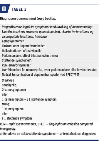 For at man kan stille diagnosen DLB, skal der foreligge en progredierende demenstilstand. DLB-diagnosen bygger på kernesymptomer og støttende symptomer [3] (Tabel 1). Der findes derudover andre typiske symptomer ved DLB, som ikke er nødvendige for diagnosen, såsom gentagne fald og synkoper, svære autonome forstyrrelser, uforklarlige bevidsthedstab, hørehallucinationer, vrangforestillinger og depression [3]. For at kunne stille diagnosen »sandsynlig DLB« skal man have to eller flere kernesymptomer eller et kernesymptom og et eller flere støttende symptomer. De kliniske kriterier for DLB har høj specificitet (95%), men derimod lav sensitivitet (32%) [4]. DLB ses med højere hyppighed hos mænd end hos kvinder og med gennemsnitlig debut omkring 75-års alderen