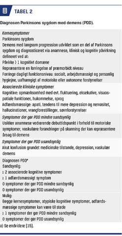 Hvis der udvikles demens ved PD inden for det første år af erkendt sygdom, klassificeres den som DLB, men sker det efter et år, diagnosticeres det som PDD [3]. Hyppigheden rapporteres varierende, men man regner med, at der vil udvikles demens hos omkring 10% pr. år i en population af patienter med PD [15]. Prædiktorer for udvikling af demens ved PD er alder, ikketremordominant parkinsonisme med tidlig udvikling af gang- og balanceforstyrrelse samt påvirkning af posteriore kortikale kognitive funktioner. I et prospektivt norsk studie rapporterede man om en prævalens på 78% efter otte års opfølgning [2]. I 2007 publiceredes der særlige diagnostiske kriterier for PDD, hvori der ikke indgik krav om amnesi (Tabel 2) [16], og anvendelse af disse kriterier vil formentlig medføre en øget rapporteret hyppighed [17].