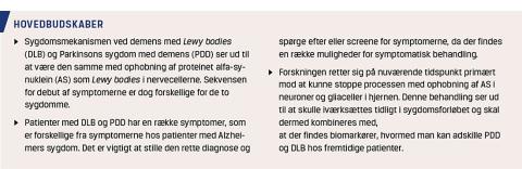 Ved både demens med Lewy bodies (DLB) og Parkinsons sygdom med demens (PDD) er der ophobning af proteinet alfa-synuklein (AS) i neuroner som Lewy bodies (LB). Sygdommene benævnes derfor også Lewy body-demenssygdomme [1]. DLB er den næsthyppigste demensdiagnose (ud fra kliniske kriterier 10-15%) [1]. Patienter med DLB har særlige symptomer, der medfører problemstillinger, som er meget forskellige fra det man ser hos patienter med Alzheimers sygdom (AD), og derfor er det vigtigt at have denne diagnose in mente, når man udreder og behandler patienter med demens. Patienter med Parkinsons sygdom (PD) har en stærkt øget risiko for udvikling af demens, og i et stort prospektivt studie har man beskrevet udvikling af demens hos op til 80% af en patientpopulation med PD [2].