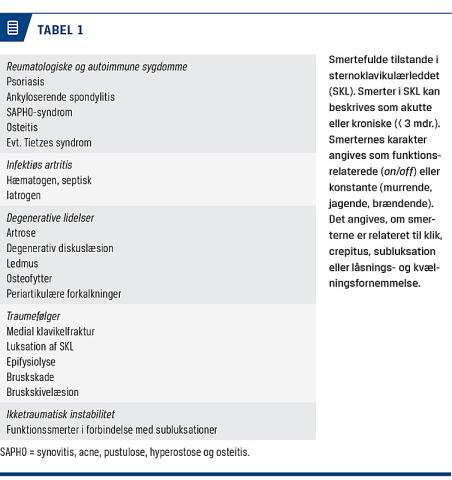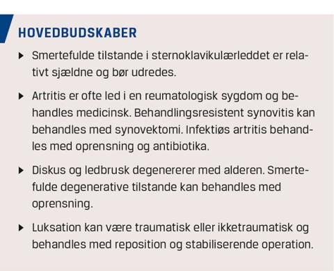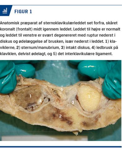 SKL er et todelt, ægte led, der stabiliserer scapula i forhold til thorax. Det er en blanding af et saddelled og et glideled. Den mediale klavikelende artikulerer både med manubrium sterni og første ribbensbrusk (Figur 1), og klaviklen er bundet ned til første ribben af det kostoklavikulære ligament 1-3 cm lateralt for SKL. Der er betydelig glidning og rotation i SKL, når armen bevæges, og eftersom det kostoklavikulære ligament er omdrejningspunktet, forstærkes bevægelser og belastninger af armen 5-7 gange i SKL pga. den store vægtstang, som klaviklen udgør [2-4]. Den intraartikulære diskus fungerer sammen med det interklavikulære ligament, der forbinder klaviklerne på oversiden af de to SKL (Figur 1) som depressor for den mediale klavikel, mens anteriore og posteriore kapselforstærkninger modvirker luksation og instabilitet [2]. Der er hyalint brusk på klavikel og sternum, og leddet er delt af en tyk diskus, som øverst insererer på klaviklens overside og nederst på første ribbensbrusk (Figur 1).