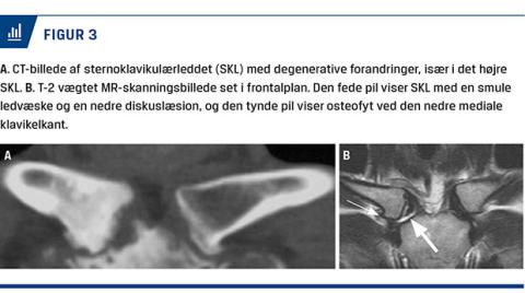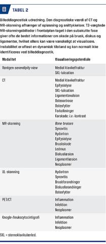 Røntgenoptagelser er vanskelige at tolke pga. overlejring af ryghvirvlerne, og CT med tredimensional rekonstruktion er bedst til kortlægning af knogleforandringer (Figur 3A). Luksation og fraktur kan dog visualiseres ved røntgen-serendipity view. Ved MR-skanning, især T2-vægtede billeder, fremstilles brusk, bruskskive og knogle (Figur 3B), herunder bone bruise, optimalt. PET/CT og knoglescintigrafi kan være relevant ved reumatologiske og neoplastiske sygdomme, hvor der ikke foreligger større strukturelle forandringer. I en del tilfælde af instabilitet er klaviklen i den største del af tiden på plads, og instabiliteten kan derfor ikke påvises billeddiagnostisk (Tabel 2).