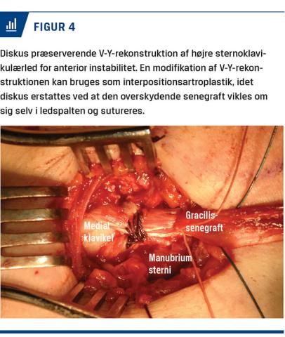 Vedvarende generende instabilitet trods reduktion i de aktiviteter, der udløser instabilitetsepisoder, både nontraumatiske og traumatiske, kan behandles med godt resultat ved en stabiliserende operation, hvor man indsætter en senegraft på forsiden af SKL i ottetalskonfiguration efter at have fjernet diskus [25-28]. Til yngre personer med intakt diskus er der udviklet en diskus- og epifysebevarende rekonstruktion, som giver gode funktionelle resultater (Figur 4) [29].
