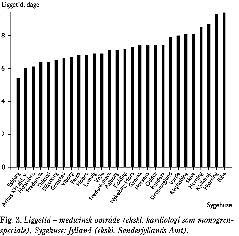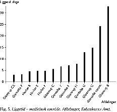 Selv om der var meget store forskelle i liggetider fra 2 til 43 dage, er der en relativt beskeden spredning i liggetid, når man set bort fra de ekstreme værdier (Tabel 1). For hele materialet er liggetiden (median, 20%- og 80%-percentilerne) 6,9 dage (5,2 og 9,5).