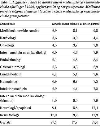 Resultater: På de fleste medicinske afdelinger var liggetiden ca. seks dage, men der var nogle større afvigelser. Liggetiden var kort på kardiologiske afdelinger og lang på geriatriske og reumatologiske afdelinger.
