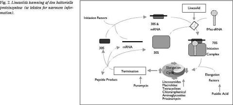 Linezolid hæmmer bakteriers proteinsyntese ved binding til 23S-delen af bakteriers 50S-ribosomale RNA og forhindrer hermed bindingen af tRNA til 50S-rRNA og derved dannelse af det for translationen nødvendige initiale 70S-kompleks (Fig. 2 ) (1-3). Denne virkningsmekanisme er unik for oxazolidinoner, og der er derfor ingen krydsresistens til andre antibiotikagrupper (1, 5-7). Linezolids begrænsede aktivitet over for gramnegative bakterier skyldes manglende permeabilitet gennem den gramnegative cellevæg og en efflukspumpe kaldet AcrAB (3). Linezolid er overvejende bakteriostatisk om end en langsom baktericid virkning på streptokokker er beskrevet (1, 5, 6, 8, 9).
