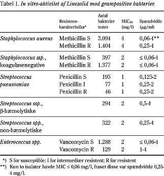 Virkningen af linezolid MIC90 på grampositive bakterier er vist i Tabel 1 (1, 5, 6, 10). Der er ingen krydsresistens med methicillin over for stafylokokker, med penicillin over for pneumokokker eller for vancomycin over for enterokokker. Linezolid er aktivt over for andre grampositive bakterier som Listeria monocytogenes (MIC ~ 1,5 mg/l), Mycobacterium tuberculosis (MIC ~ 2 mg/L og Corynebacterium spp. (MIC ~ 0,25 mg/l) (1, 10, 11).