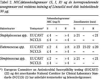 I Tabel 2 er der angivet følsomhedgrænser (breakpoints ), for linezolid og de korresponderende zonediametre ved resistensundersøgelser i det mikrobiologiske laboratorium, som de i 2001 er fastlagt fra henholdsvis European Committee on Antimicrobial Susceptibility testing (EUCAST) (22) og det amerikanske National Comittee for Clinical Laboratory Standards (NCCLS) (1).