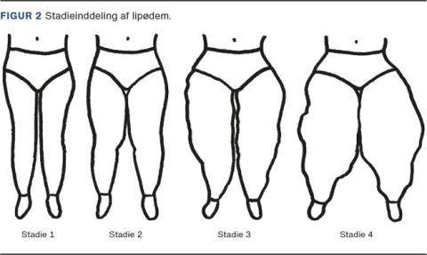 Lipødem klassificeres i fem typer baseret på fordelingen af fedtvæv (Figur 1). Patienter med lipødem kan have en blanding af de forskellige typer, idet både underekstremiteter og overarme kan være involveret [19]. Herudover inddeles lipødem i fire stadier efter sværhedsgrad (Figur 2). Fra stadie 1 til stadie 3 ændrer hudoverfladen sig fra at være normal til at være deform pga. stor fremvækst af knudret fedtvæv. I stadie 4 ses lipødem med lymfødem (lipolymfødem) [7]. Det progressive forløb af lipødem er forbundet med vægtøgning, hvor en stigning i vægt typisk ledsages af en uforholdsmæssig stor stigning af fedtvæv i underekstremiteterne og sjældnere i overarmene. Der er ingen data, der understøtter, at lipødem i sig selv er en tilstand, som progredierer [1, 19].