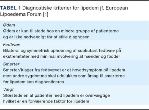 Lipødem er inkluderet i den 11. reviderede version af WHO’s internationale sygdomsklassifikation (ICD-11) med diagnosekoden EF02.2 [20]. Lipødem diagnosticeres på baggrund af anamnese, klinisk undersøgelse og udelukkelse af andre årsager. Der findes på nuværende tidspunkt ingen biokemiske markører til diagnostik af tilstanden [5]. På trods af navnet er ødem kun til stede hos en lille undergruppe af patienterne, hvorfor der i øjeblikket arbejdes på en navneændring fra lipødem til lipalgiasyndrom (fra det oldgræske lipos = fedt og algos = smerte) [1]. De første diagnostiske kriterier er beskrevet i 1951 og har stort set ikke ændret sig siden [21]. Der findes dog forskellige modificerede versioner og divergerende opfattelser af de diagnostiske kriterier. I 2020 er European Lipoedema Forum nået frem til en konsensus om lipødem for at strømline kriterierne (Tabel 1) [1]. Lipødem er fortsat en omdiskuteret tilstand, og der mangler håndfaste kriterier for diagnosen. Det kan således være vanskeligt for klinikere at skelne mellem fedme og kroniske smertetilstande med eller uden psykisk komorbiditet.