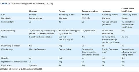 De væsentligste differentialdiagnoser præsenteres i Tabel 2. Lipødem forveksles ofte med især fedme eller lymfødem. Patienter, der lider af fedme, vil, modsat patienter med lipødem, have en global, visceral og subkutan ophobning af smertefrit fedtvæv. Grundet kraftige fibrøse strøg kan der også ved fedme ses knudret og mere ømt fedtvæv i underekstremiteterne end andre steder i kroppen [1, 5]. Ved lipødem er mængden af fedtvæv i underekstremiteterne signifikant højere end hos kontrolpersoner, når der er justeret for BMI [2]. Hos patienter med lymfødem vil der være kompromitteret lymfedrænage samt pitting ødem, hvilket ikke ses ved lipødem [1, 5].
