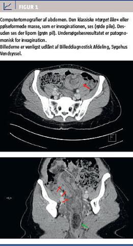 Objektivt fandtes patienten ikke akut påvirket. Hun var direkte øm og slipøm i venstre fossa og over symfysen. Der var ingen positive fund i øvrigt. Der var normale biokemiske værdier, fraset et C-reaktivt protein-niveau på 63 mg/l. En akut computertomografi (CT) af abdomen viste invagination i sigmoideum (Figur 1). Den strakte sig ned i øvre del af rectum til noget, der lignede reaktionsløst fedt. Slim-hinden i invaginationen havde dårlig opladning som tegn på kompromitteret perfusion. Derudover så man fri væske, men ingen fri luft.