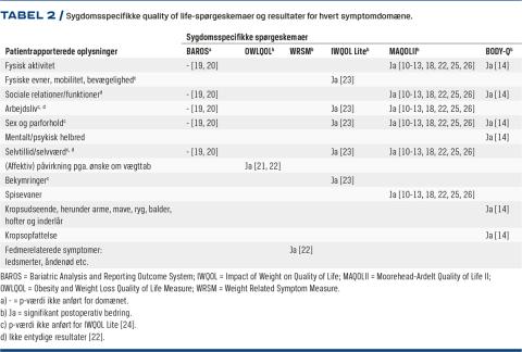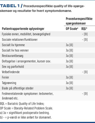 The Impact of Weight on Quality of Life Lite (IWQOL Lite) [23, 24] består af i alt 31 spørgsmål fordelt på fem domæner (fysisk funktion, selvtillid, sexliv, arbejde og bekymringer) scoret på rangordnet Likertskala (specifik domænescore og summeret score). IWQOL Lite blev anvendt i to studier (se diskussionsafsnit nedenfor) (n = 2.137 og n = 67, followup: hhv. to og fem år) [23, 24]. I begge studier fandt man signifikant forbedret QoL.