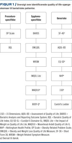 I nærværende analyse defineres tre typer spørgeskemaer [6]. Procedurespecifikke spørgeskemaer er validerede hos patienter før og efter bariatrisk kirurgi. Sygdomsspecifikke spørgeskemaer er validerede hos ikkeopererede patienter. De to typer spørgeskemaer adskiller sig ikke væsentligt fra hinanden og er ikke i tidligere studier sammenlignet over for hinanden. Procedure-/sygdomsspecifikke spørgeskemaer er mere følsomme for ændringer over tid end generiske spørgeskemaer. I generiske spørgeskemaer fokuseres der på generel sundhedsrelateret QoL uafhængigt af specifikke sygdomme. Fordelen ved generiske spørgeskemaer er, at de muliggør sammenligning af sundhedsrelateret QoL på tværs af forskellige sygdomme. Optimalt anvendes der et spørgeskemabatteri med sammensætning af procedure-/sygdomsspecifikke og generiske typer spørgeskemaer for at kunne belyse den multifaktorielt betingede QoL hos den bariatriske patient [7].