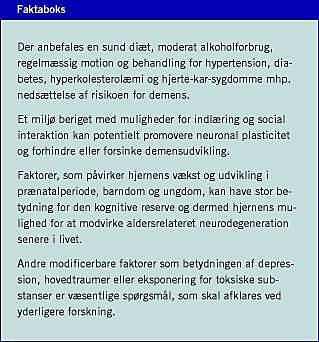 Summary Lifestyle-related risk factors for dementia Ugeskr Læger 2006;168(40):3401-3405 Emerging knowledge about modifiable risk factors for dementia has given rise to interventions that can potentially prevent or delay the onset of dementia and the possible target periods for intervention extend from prenatal period to old age. Factors during early life such as nutrition, education, and parental socioeconomic status can influence the development of dementia later in life. From mid to late life, a physically, socially, and intellectually active lifestyle is associated with reduced risk for dementia. Moreover, modification of cardiovascular risk factors during this period can potentially reduce risk for dementia.