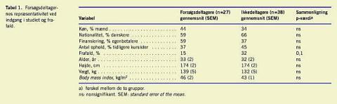 Forsøgsdeltagerne udgjorde ved indgangen i studiet et repræsentativt udsnit af kursisterne ved Ebeltoft Kurcenter, idet de hverken ved køn, antal ophold, alder, højde, vægt eller BMI var signifikant forskellige fra resten af kursisterne (Tabel 1). Dog var der en tendens (p = 0,1) til, at forsøgsdetagerne havde mindre frafald end de øvrige kursister (Tabel 1).