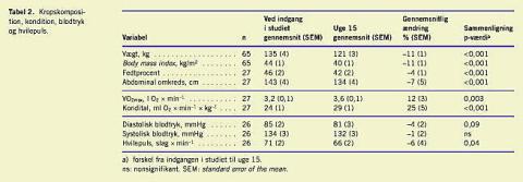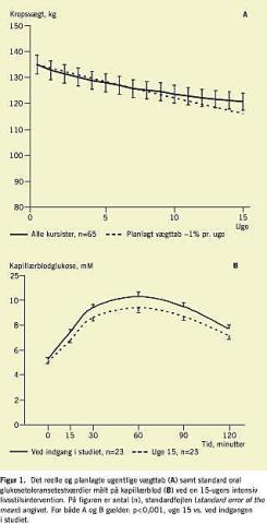Materialer og metoder: De 27 forsøgsdeltagere blev vejet ugentlig. Fedtprocent, abdominalomkreds, kondital, hvilepuls, oral glukosetolerans og lipidprofil blev målt ved indgang i studiet og i uge 15. Den intensive livsstilsintervention blev gennemført under supervision på et ophold på Ebeltoft Kurcenter, og målet var et vægttab på ∼ 1% pr. uge.