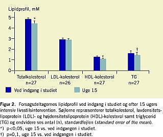 I overensstemmelse med resultaterne i flere tidligere studier [12, 13] havde forsøgsdeltagerne på trods af deres kropssammensætning og høje BMI en normal lipidprofil ved indgangen i studiet. Totalkolesterol og TG-koncentrationerne var markant lavere efter 15 ugers intervention. I modsætning hertil var der ingen reduktion af LDL-kolesterol-koncentrationen efter interventionen, hvilket ellers ofte er en konsekvens af intentionelt vægttab, idet en lavenergidiæt ofte vil have et lavt indhold af mættet fedt og kolesterol, som burde få LDL til at falde [14, 15]. Også i andre vægttabsstudier har man fundet, at LDL ikke blev reduceret, og dette kan skyldes, at et akut vægttab bevirker en stigning i koncentrationen af frie fede syrer (FFA) i blodet, hvorved der er en øget forsyning af FFA til leveren, som øger syntesen af very-low-density lipoprotein (VLDL), hvilket kan føre til en stigning i LDL [15]. Forsøgsdeltagerne var stadig i vægttabsfase i uge 15, og det er muligt, at et fald i LDL først ses, når deltagerne bliver vægtstabile [15]. Ydermere fandt vi, at forsøgsdeltagernes HDL-kolesterol-koncentration faldt i løbet af interventionen. Det er velkendt, at fysisk aktivitet har en uafhængig positiv effekt på HDL [16], og vi havde derfor umiddelbart forventet en stigning i HDL hos deltagerne. I studier af 18-36 måneders varighed, hvor interventionen bestod af kostændringer og fysisk aktivitet, har man fundet, at HDL-koncentrationen blev øget i forhold til koncentrationen ved indgangen i studiet [17], mens man i andre studier har fundet, at både LDL, TG og HDL blev reduceret [14, 15]. Samlet set fandt vi en forbedring i forsøgsdeltagernes totale lipidkoncentration, mens vi ikke så nogen signifikant ændring i lipidsammensætningen (LDL/HDL-ratio). Det er derfor uklart, om den undersøgte livsstilsintervention akut kan forbedre kursisternes blodlipidprofil.