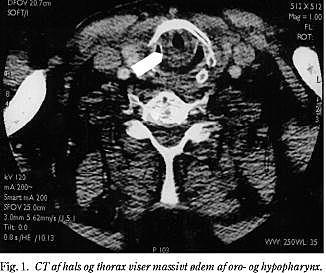 Patienten havde inspiratorisk stridor og ødematøs hals. En laryngoskopi viste blegt ødem, dette blev bekræftet af en CT (Fig. 1 ). Der blev givet adrenalin som inhalation, samt methylprednisolon og clemastin i.v. Herpå skete der en kortvarig bedring, men efter få minutter indtrådte der komplet luftvejsobstruktion og respirationssvigt. Patienten blev anæsteseret, og der blev gjort to forsøg på oral intubation med laryngoskop, samt forsøg på fiberskopisk intubation. Patienten kunne ikke maskeventileres, og det var ikke muligt at udføre nødtrakeotomi grundet ødem på den ydre hals. Endnu et forsøg på oral intubation lykkedes. Patienten fik undervejs minutter varende asystoli. Sinusrytme genetableredes efter intubation, ventilation og adrenalin i.v. Senere blev der med nogen besvær anlagt regelret trakeostomi. Steroidterapien fortsatte, og ødemet aftog over nogle dage. Patienten blev udskrevet med enkelte neurologiske skader til planlagt opfølgning i neuropsykologisk regi.