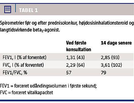 Efterfølgende havde patienten funktionsdyspnø, natlig trykken for brystet og behov for SABA 3-17 gange dagligt. To måneder efter udskrivelsen blev hun henvist til behandlingsoptimering hos en praktiserende lungemedicinsk speciallæge. En spirometri viste her obstruktivt nedsat lungefunktion (FEV1 1,31 l (43% af forventet), forceret vitalkapacitet (FVC) 2,29 l (64% af forventet), FEV1/FVC 57%) (Tabel 1). Koncentrationen af nitrogenoxid i udåndingsluften (15 ppb) og eosinofilocytter (0,04 × 109) var normale. Man fandt ved brug af en træningsfløjte insufficient inspiratorisk flow i forhold til brug af turbohaler. Astmabehandlingen blev optimeret med et for patienten anvendeligt device i form af inhalationsspray på aerochamber, tillæg af langtidsvirkende beta2-agonist, ændring af højdosisinhalationssteroid (salmeterol/fluticasonpropionat 25/250 mikrogram/sug 2 sug × 2), SABA på spray anvendt alene eller på aerochamber samt en prednisolonkur på 37,5 mg × 1 i ti dage.