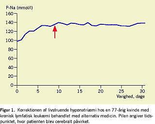 En 77-årig kvinde blev indlagt akut på medicinsk afdeling pga. afkræftelse, kvalme og sløvhed. Patienten var i behandling med bendroflumethiazid med kaliumchlorid for let hypertensio arterialis og havde i 2002 fået konstateret CLL, men hun ønskede ikke kontrol herfor i et hæmatologisk ambulatorium. Patienten kontaktede i stedet en privatpraktiserende læge mhp. alternativ behandling, som blev påbegyndt uden videre. Hos den praktiserende læge blev der bl.a. i tre år givet seks behandlinger om måneden bestående af infusion af højdosis C-vitamin. Hver af disse behandlinger kostede 700 kr. (i alt 151.200 kr. i perioden). Desuden tog patienten naturmedicin, der bestod i hyperimin, Ginkgo biloba, liponsyre, kosttilskud og vitaminer. Endvidere drak hun 2-3 liter kildevand og sojamælk om dagen og undgik fuldstændig indtagelse af sukker »for ikke at stimulere kræftcellerne«. På indlæggelsestidspunktet var hun dehydreret, betydeligt svækket og sløv. Der var ingen forstørrede lymfeknuder på halsen, aksillært eller i lysken og ingen hepatosplenomegali. Blodprøverne viste svære elektrolytforstyrrelse med plasma (P)-natrium på 97 mmol/l, P-kalium på 2,1 mmol/l, og P-creatinin på 26 mmol/l. Der var hæmoglobinværdi på 7,7 mmol/l, leukocyttal på 140,5 × 109/l og trombocyttal på 166 × 109/l. Naturmedicinen blev seponeret, og der blev påbegyndt rehydrering og langsom korrektion af den svære natriumdeficit. Korrektionen foregik over 15 dage med en gennemsnitlig stigning i P-natrium-koncentrationen på 4,3 mmol pr. dag (Figur 1). Under indlæggelse blev patienten efter normalisering af p-natrium tiltagende cerebralt påvirket med rigiditet, talebesvær, synshallucinationer og angstanfald. En lumbalpunktur viste ingen tegn på infektion. Ved en magnetisk resonans (MR)-skanning af centralnervesystemet påvistes mindre subkortikale, ældre infarkter, men ingen tegn på central pontinmyelinolyse. Ved neurologisk tilsyn fandtes der ingen tegn på motorisk eller sensorisk dysfunktion, og tilstanden tolkedes som en metabolisk udløst psykotisk tilstand. Ved psykiatrisk tilsyn fandtes patienten ikke produktiv psykotisk eller depressiv, men svært angstpræget. Hun var i alt indlagt i 40 dage og var på udskrivningstidspunktet uden neurologiske sequelæ og psykisk i sin habitualtilstand. Blodprøverne viste på dette tidspunkt hæmoglobinværdi på 7,9 mmol/l, leukocyttal på 129 × 109/l, trombocyttal på 199 × 109/l, P-natrium på 136 mmol/l og P-kalium på 4,2 mmol/l.