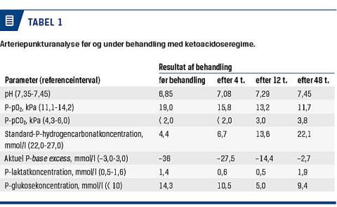 Godt et år senere blev patienten akut indlagt pga. gradvist dårligere almentilstand over de seneste 3-4 dage. Ved ankomsten til sygehuset var hun vågen, men alment og cerebralt påvirket. Respirationsfrekvensen var 24 åndedrag/minut. Pulsen var regelmæssig med 124 slag/minut, og blodtrykket var 120/78 mmHg. En arteriel blodgasanalyse viste udtalt metabolisk acidose med en pH-værdi på 6,85 (Tabel 1). Blodsukkerniveauet var 14,3 mmol/l. En urinstiks var positiv for