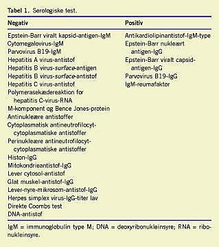 En 40-årig kvinde med reumatoid artritis blev sat i sulfasalazinbehandling. På 21.-dagen var der normale levertal, og i det 22. døgn fik hun feber 39,7 °C samt kløende blærer på mave og bryst. Hun seponerede selv sulfasalazin på dag 24. Hun fik ansigtshævelse, dyspnø, kvalme, træthed, mørk urin og lys afføring. Hun blev indlagt på en medicinsk afdeling og var ikterisk, febril, ødematøs i ansigtet og havde småplettet, konfluerende, højrødt eksantem universelt. Der var lymfeknudeforstørrelse supraklavikulært og i højre armhule. Patienten havde ikke haft nogen seksuel kontakt de seneste to år, hun havde intet forbrug af alkohol, narkotika, naturmedicin eller svampe, og seneste rejser var til Lanzarote i 2004 og Afrika i 2002. Parakliniske undersøgelser viste alaninaminotransferase (ALAT) 867 U/l, basisk fosfatase (BF) 423 U/l, bilirubin 54 μ mol/l og koagulationsfaktorer (koag.) 0,99. En ultralydundersøgelse (UL) viste en splenomegali på 16 cm; et thoraxrøntgen viste normale forhold. På grund af leukocytose og højfebrilia med ukendt focus blev der påbegyndt behandling med bredspektret antibiotika, men leukocyttallet steg fortsat, og temperaturen forblev over 39 °C. Perifert blodudstryg viste lymfoplasmacytose og 15% cirkulerende plasmaceller, hvoraf nogle frembød let cytologisk atypi med forhøjet kerne/cytoplasmaratio. Fundet blev tolket som værende foreneligt med enten en reaktiv tilstand eller leukæmi. En knoglemarvsundersøgelse viste reaktiv tilstand med 15-20% plasmaceller uden atypi, middellivlig normalfordelt myelopoiese og intakt erytrocyt- og trombocytlinje. Immunfænotype- og kromosomundersøgelse viste normale forhold. Patienten fik universel lymfeknudeforstørrelse. Ved lysmikroskopi af lymfeknuden blev der påvist udslettet follikelarkitektur og diffust fordelte, middelstore lymfocytter med uregelmæssige kerner. Desuden blev der fundet let eosinofili, forekomst af plasmaceller og mange histiocytter, hvoraf nogle frembød erytrofagocytose. Immunfænotypning viste næsten komplet fortrængning af B-celler, imens de dominerende T-celler var abnormt fordelt med svær overvægt af cluster of differentiation (CD)4-positive celler. Tilstanden blev primært tolket som perifert T-celle-lymfom. En hudbiopsi viste enten erythema multiforme eller paraneoplastisk pemfigus. De serologiske fund ses i Tabel 1 .
