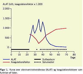Dag 53 efter påbegyndelse af sulfasalazinbehandlingen blev patienten udskrevet med reduceret steroiddosis og var derefter velbefindende på methotrexatbehandling med normaliseret paraklinik og normale forhold fundet ved objektiv undersøgelse.