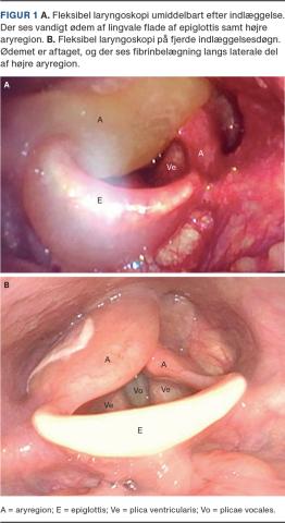 En fornyet skopi efter ca. 30 min viste progression af ødemet med vanskeligt indblik til rima (Figur 1A). Luftvejen blev betragtet som truet, og i kirurgisk luftvejsberedskab udførtes vågen fleksibel optisk intubation, hvorefter patienten blev overflyttet til intensivafdelingen.
