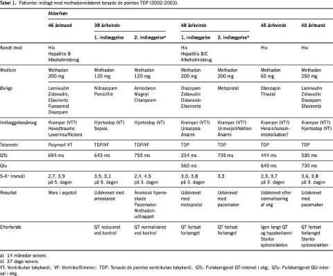 I Tabel 1 resumeres de fem sygehistorier. Alle patienterne var tidligere opiatmisbrugere og havde været i methadonsubstitutionsbehandling gennem flere år. To af patienterne var indlagt to gange. Indlæggelsesårsagen var i de fleste tilfælde kramper og mistanke om overdosis. Kun i et enkelt tilfælde var indlæggelsesårsagen en anden, og patienten fik hjertestop på hospitalet. Ved indlæggelserne var patienterne upåvirkede. Der fandtes vekslende grader af hypokaliæmi samt sinusbradykardi og langt QT-interval (QTc > 540 ms) eller stor U-tak i ekg (målt fra Q-takkens nadir til T-takkens afslutning, eller ved U-takkens afslutning). S-magnesium blev målt hos fire af de fem patienter og var normalt, ligesom ekkokardiografi var normal. Under monitorering udvikledes repetitive løb af non-sustained og sustained TDP, der krævede elektrisk defibrillering. Anfaldene var forudgået af tiltagende ektopisk aktivitet i form af monomorfe ventrikulære ekstrasystoler i op til bigemini, der efter kortere eller længere tid udløste TDP ved et R på T-fænomen (Figur 1 ).