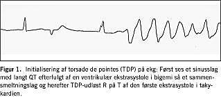 Torsade de pointes (TDP) er en polymorf ventrikulær takykardi (VT) relateret til langt QT-syndrom (LQTS). Ud over elektrolytforstyrrelser som hypokaliæmi og hypomagnesiæmi udgør lægemidler den vigtigste årsag til det erhvervede LQTS [1, 2]. Methadon er ikke normalt registreret blandt disse lægemidler. Inden for mindre end to år har vi hos fem patienter i højdosis metadonsubstitutionsbehandling set LQTS med livstruende, repetitiv TDP. Anfald af kramper og synkope kan være symptomer på malign arytmi, og det anbefales, at disse patienter forsøges kontrolleret med ekg.
