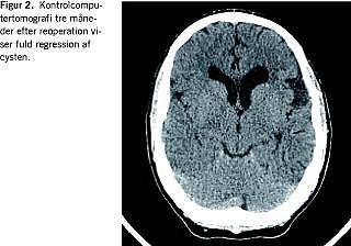 To timer efter operationen var patienten vågen, og ptosen var svundet. I løbet af de følgende tre dage svandt den ekspressive afasi. Ved udskrivelsen til hjemmet på sjette dag var han neurologisk intakt og i øvrigt velbefindende. På tiende dag blev han igen indlagt under samme billede. Fornyet computertomografi viste gendannet cyste. Efter reoperation og klinisk kontrol inklusive computertomografi tre måneder senere (Figur 2 ) var han velbefindende og uden mén.