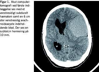 Akut computertomografi viste et venstresidigt subduralt let hyperdenst hæmatom kombineret med en 6 cm stor venstresidig temporofrontal arachnoideacyste, som indeholdt blod. Der var subfalcin herniering på 10 mm (Figur 1 ).