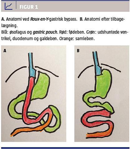 Revertering af en gastrisk bypassoperation er risikabel, men kunne hos patienten i sygehistorien gennemføres laparoskopisk uden per- og postoperative komplikationer. Der findes kun få publicerede data vedrørende tilbagelægning af gastrisk bypass (Figur 1), der langt overvejende har været udført via åben kirurgi [4, 5]. Der findes ingen guidelines, som foreskriver udredningsprogram, indikationer eller operationsmåde. Beslutningen må tages i bariatrisk centerregi med involvering af kirurger, medicinere og diætister samt vurdering af psykiatere og kan først komme på tale, når andre behandlingsmuligheder er udtømt.