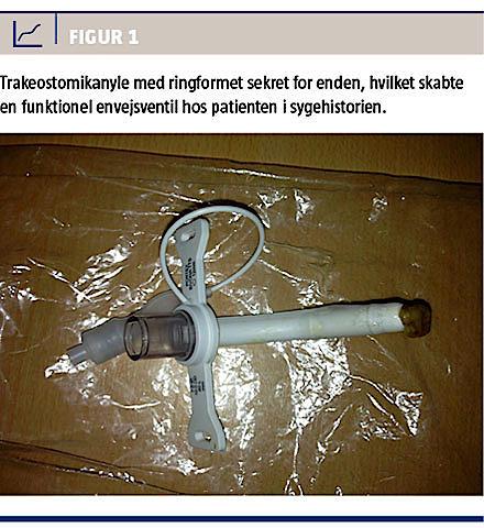 En 54-årig tidligere rask, men nu tetraplegisk, trakeostomeret mand blev indlagt med henblik på optræning af et hjemmerespiratorhold, efter at han en måned forinden havde pådraget sig en traumatisk læsion af medulla cervicalis. I dagene efter fik han foretaget en dilatationstrakeostomi, og der blev ukompliceret indsat en trakeostomikanyle størrelse syv. Efterforløbet var kompliceret af pneumonier. En uge inden hændelsen fik han hjertestop sekundært til en lungeemboli. Han blev genoplivet samt trombolyseret, og der blev påbegyndt warfarinbehandling.