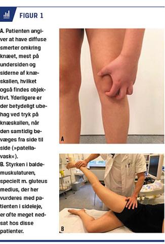 Hun var lidt kalveknæet og platfodet. Hun hang med hoften, når hun stod på et ben. Der var betydelig ømhed ved tryk på bløddelene på siderne af knæet og distalt for knæskallen, men kun let ømhed på selve knæskalssenen. Der var ubehag ved tryk på knæskallen, når den samtidig blev bevæget fra side til side (»patellavask«) (Figur 1A). Den øvrige undersøgelse inkl. UL-skanning viste normale forhold. Efter klinisk og ultrasonografisk at have sandsynliggjort, at der ikke var tale om anden skade, blev pigen diagnosticeret med forreste knæsmerter/patellofemoralt smertesyndrom. Behandlingen vil her oftest bestå af en kombination af reduceret belasting og fysioterapeutisk vejledt hofte- og knæstabiliserende træning.