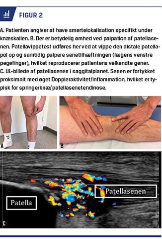 II. En 35-årig lettere overvægtig mand havde smerter på forsiden af højre knæ. Han havde ikke løbet regelmæssigt i årevis og var startet med at træne for syv uger siden. Han øgede hurtigt intensiteten på sine løbeture, men efter fire uger mærkede han ømhed på forsiden af højre knæ. I starten var der lette smerter ved opvarmning, men de forsvandt, når han var blevet varm, for så at komme tilbage om aftenen. Efterhånden føltes hans ben stift, og det gjorde ondt, når han gik ned ad trapper. Han var meget øm midt på knæskalssenen, og en patellavippetest (Figur 2B) var positiv. De øvrige objektive undersøgelser viste normale forhold. En UL-skanning viste diskret fortykkelse af patellasenen og øget Doppler-signal. Han diagnosticeredes med springerknæ/patellasenetendinopati, hvor behandlingen,