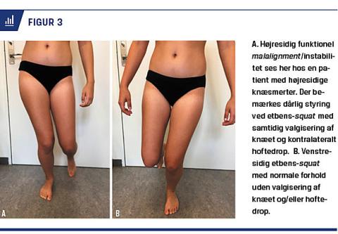 Længerevarende knæsmerter hos løbere er ofte associeret med nedsat muskelstyrke og/eller muskelubalance. Specielt er nedsat muskelstyrke i patients core-hofte-muskulatur en væsentlig del af problemstillingen [20, 21]. Behandlingen består i fysioterapeutisk vejledt genoptræning. I et studie sammenlignede man 30 skadede løbere med 46 ikkeskadede løbere og fandt, at de skadede løbere havde en signifikant nedsat styrke i hofteabduktorer og -fleksorer på den afficerede side [20]. Desuden fandt man større styrke i hofteadduktorerne på den afficerede side end på den raske side [20]. Samlet tyder dette på en sammenhæng mellem løbeskader og nedsat styrke i core-hofte-muskulaturen, hvilket stemmer godt overens med det kliniske billede, hvor der i langt de fleste tilfælde af både forreste knæsmerter, løberknæ og springerknæ findes nedsat styrke i glutealmuskulaturen (Figur 1B) og i hoftefleksorerne. Objektivt ses funktionel malalignment/instabilitet, hvilket vil sige dårlig styring ved etbens-squat med samtidig valgisering af knæ og kontralateralt hoftedrop (Figur 3A). Dette kan i høj grad afhjælpes med funktionel stabilitetstræning og core-træning [22], der er det primære træningsområde hos disse patienter. Netop øget hofteadduktion er sammen med øget indadrotation i knæet og ipsilateral fleksion i overkroppen potentielle risikofaktorer for udvikling af løberknæ [21]. I fysioterapeutisk regi vil man forsøge at forebygge og behandle disse biomekaniske risikofaktorer ved styrketræning