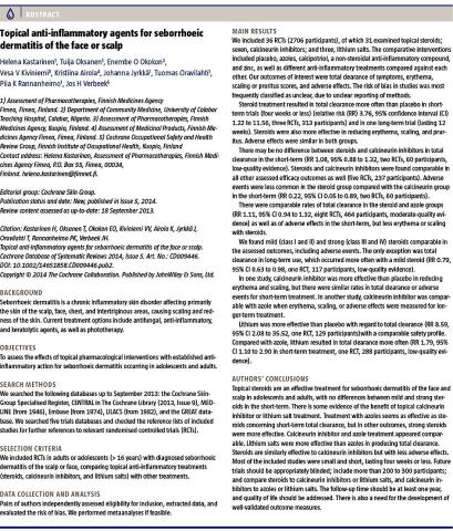 Cochraneanalysen omhandler en væsentlig problemstilling vedrørende behandlingen af SD, som er en hyppig hudlidelse. Analysen omfatter antiinflammatoriske præparater, mens der i forhold til antimykotisk lokalbehandling henvises til en tidligere Cochraneanalyse [4]. Ved opslag i The Cohrane Collabo-