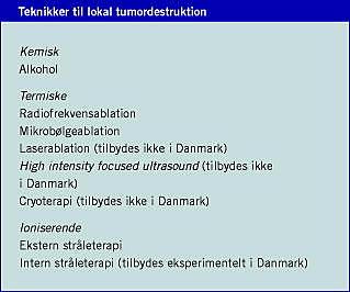 Patienter med levertumorer eller metastaser, der ikke kan fjernes ved radikal kirurgisk resektion, kan eventuelt tilbydes behandling med lokal tumordestruktion. I denne statusartikel vil vi give en kort oversigt over de tilgængelige metoder, der anvendes i Danmark, samt deres nuværende status iht. litteraturen. Statusartiklen vil ikke omhandle lokal kemoterapi, intern og ekstern strålebehandling samt kombinationsbehandlinger mellem kemoterapi og kirurgi/lokalbehandling.