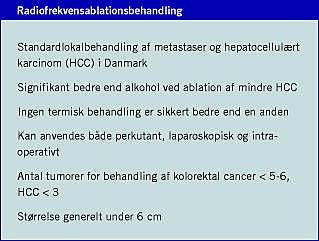Kemisk ablation med injektion af absolut alkohol i tumorer var tidligere den mest udbredte behandling især ved HCC, men sammenlignende RCT viser, at termisk ablation er overlegen på de vigtigste effektparametre: cancerfri overlevelse og samlet overlevelse [3, 4]. Dette har betydet, at termisk ablation til såvel HCC som metastaser anses for at være standardlokalbehandling. Alkoholinjektionsbehandling kan dog anvendes til HCC, som er for store eller uregelmæssige til termisk ablation. Den nyeste RCT af HCC tyder også på, at man ved behandlingen af HCC bør benytte radiofrekvensablation (RFA) og alkoholinjektion som kombination frem for RFA alene [5]. De termiske ablationsteknikker omfatter RFA, mikrobølgebehandling (MCT), laserinduceret termoterapi, cryoterapi og højintensitetsfokuseret ultralyd. De tre sidste teknikker tilbydes p.t. ikke i Danmark. RFA er den mest udbredte behandling. Der er ingen RCT, der viser, hvilken termisk behandling der er bedst til hverken HCC eller metastaser, men i langt de fleste publicerede undersøgelser har man anvendt RFA. Teknik, sikkerhed, komplikationer, effekt og resultater ved brug af RFA er derfor den bedst beskrevne i litteraturen. To danske undersøgelser vedrørende brugen af RFA ved levertumorer er tidligere publiceret [6, 7]. Langtidsopfølgning af resultaterne af brug af RFA hos danske patienter viste en medianoverlevelse på 32 måneder og en fireårsoverlevelse på 26% for KRC-metastaser, hvilket er på niveau med overlevelsesresultater internationalt ved brug af RFA og ved kirurgisk leverresektion [8]. RFA har den fordel, at den kan udføres såvel minimalt invasivt som perkutant eller laparoskopisk vejledt af ultralyd eller computertomografi samt ved åben intraoperativ procedure (Figur 1 og Figur 2 ). MCT og cryoterapi udføres derimod primært intraoperativt og dermed mere invasivt. Generelt bliver der fundet flest metastaser, der kan behandles, når proceduren fortages intraoperativt eller laparoskopisk, men der foreligger ingen RCT-data, hvor man sammenligner applikationsmetoderne. Valget må derfor afhænge af patientens risiko ved en invasiv procedure og forandringernes placering iht. metodens mulighed for nøjagtig applikation af RF-energien til tumorerne. Der er i dag flere tilgængelige udstyr til RFA, men der findes ingen sikre data fra RCT, der kan afgøre, hvilket udstyr der giver de bedste resultater. Den population af patienter, der tilbydes lokal behandling i Danmark, er primært patienter med metastaser efter KRC. Der foreligger ingen data fra RCT om, hvilket antal metastaser man kan og bør behandle, og om patienterne skal behandles med kun RFA eller i kombination med kemoterapi. For tiden er der et multicenterstudie i gang under EORTC - CLOCC-studiet, hvor man behandler op til ti metastaser efter KRC og randomiserer til kemoterapi alene eller kemoterapi og RFA [9]. Dette studie kan forhåbentlig i fremtiden give os mere sikre retningslinjer for behandlingerne. Indtil da bør behandlingen gives under løbende opfølgning, hvor det er vigtigt, at de enkelte patientforløb bliver vurderet individuelt og tværfagligt.