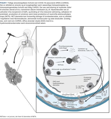 Det er muligt, at IFN-signalering har en dobbeltrolle, der kan yde essentiel tidlig beskyttelse, men samtidig kan bidrage til hyperinflammation og patologi og således være sygdomsforstærkende på et senere tidspunkt [24]. Flere studier har desuden vist opregulering af proinflammatoriske mediatorer, herunder velkendte proinflammatoriske cytokiner og kemokiner, såsom interleukin (IL)-1B, IL-6, IL-8, CXCL-10 og MP-10 i både blod [25] og BAL-væske [14]. Derudover er komplementfaktor C5a og dens receptor C5AR1 opreguleret i lungerne ved CARDS afhængig af sværhedsgrad [26] og spiller muligvis en afgørende rolle i at vedligeholde lungeinflammation med aktivering og rekruttering af myeloide celler samt aktivering af koagulationskaskaden [27]. Væsentlige patogenetiske faktorer er skitseret i Figur 1.